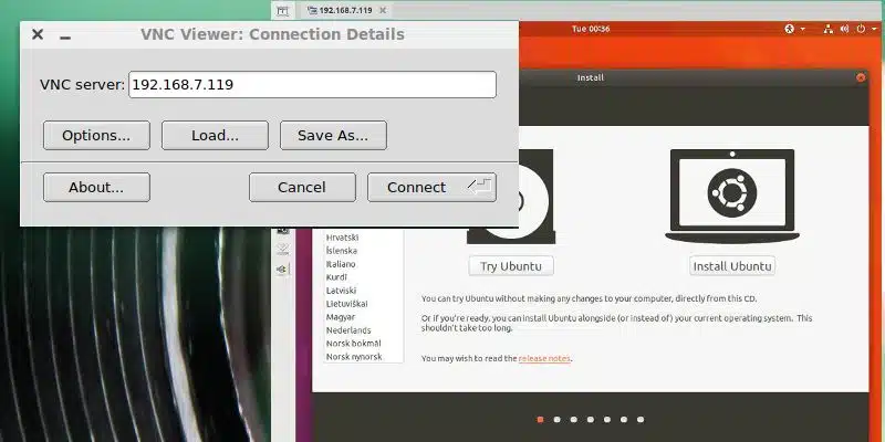 على الجهاز العميل قم بفتح TigerVNC. فمن المحتمل أن يسمى “vncviewer” على النظام الخاص بك. نافذة بسيطة جدا. أدخل عنوان IP الخاص بالخادم وقم بالاتصال.
