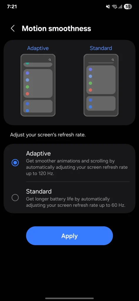 لتحسين سلاسة الحركة، افتح الإعدادات، وانتقل إلى الشاشة، ثم انقر فوق سلاسة الحركة. سترى خيارين: قياسي Standard (معدل تحديث ثابت يبلغ 60Hz) و تكيفي Adaptive. يمكن للخيار الأخير رفع معدل التحديث إلى الحد الأقصى لهاتفك (عادةً 120Hz) أثناء التمرير أو ممارسة الألعاب، وخفضه مرة أخرى عندما يكون المحتوى ثابتًا لتوفير الطاقة.