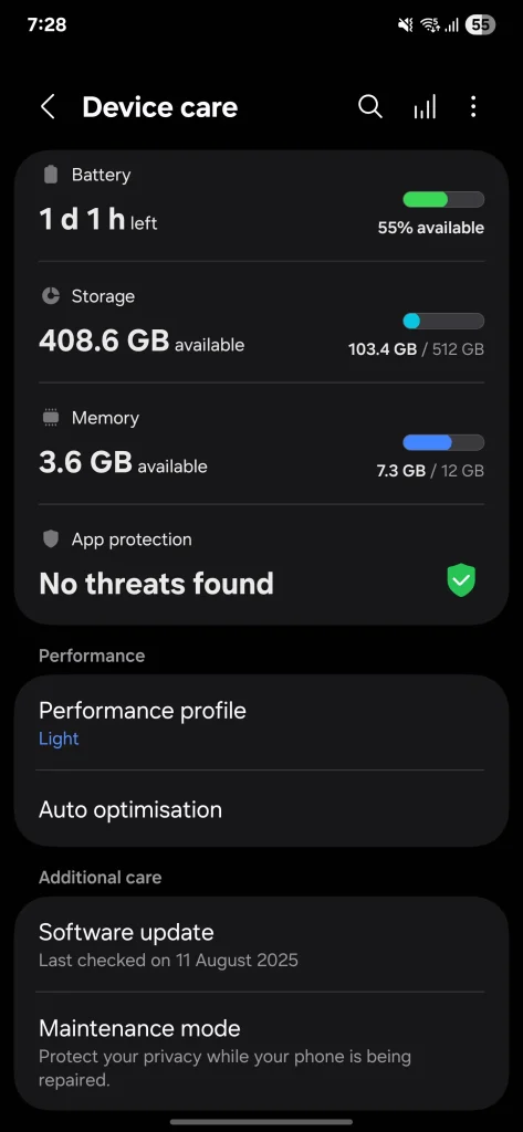 للاستفادة من هذه الميزة، انتقل إلى الإعدادات، ثم افتح العناية بالجهاز، وبعدها التحسين التلقائي. اضغط على إعادة التشغيل التلقائي، ثم فعّل خيار إعادة التشغيل حسب الجدول الزمني، واختر اليوم والوقت الذي يناسبك.