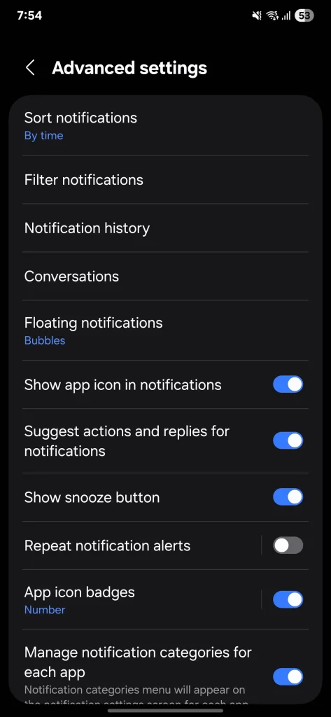 أثناء وجودك في نفس القائمة، يمكنك أيضًا تمكين خيار إظهار زر الغفوة (Show snooze button). تتيح لك ميزة الغفوة إخفاء إشعار وإعادته لاحقًا، مما يساعد عندما لا تريد التعامل مع شيء ما على الفور ولكنك لا تريد أن تفقده أيضًا. تعتبر ميزة سجل الإشعارات (Notification History) أداة قوية لإدارة الإشعارات بكفاءة.
