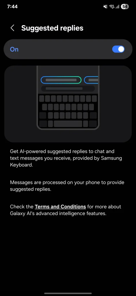 لكي تعمل ميزة **الردود المقترحة** بشكل صحيح، يجب أن تكون لوحة مفاتيح Samsung Keyboard هي لوحة المفاتيح الافتراضية. تحقق من ذلك في الإعدادات > الإدارة العامة > قائمة لوحات المفاتيح ولوحة المفاتيح الافتراضية > لوحة المفاتيح الافتراضية. إذا كنت تستخدم لوحة مفاتيح أخرى، فلن تظهر الاقتراحات داخل تطبيقات الدردشة.