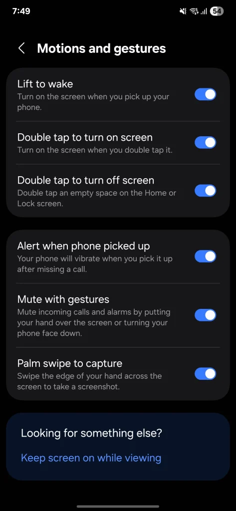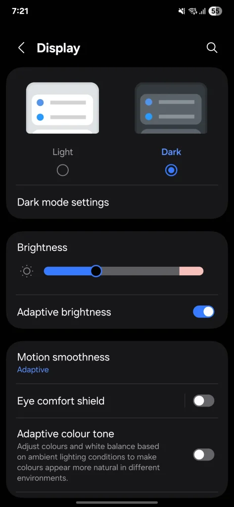 تمتلك هواتف Samsung إعدادًا يسمى “Motion smoothness” أو “سلاسة الحركة“، والذي يتحكم في مدى استجابة الشاشة للمس. على الرغم من أن معدلات التحديث العالية أصبحت شائعة في الهواتف ذات الميزانية المحدودة الآن، إلا أنه لا يزال من المفيد التحقق من تمكين هذا الخيار لتحسين تجربة المستخدم.