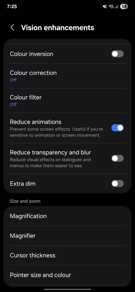 إذا كنت ترغب في أن تبدو الواجهة أسرع، يمكنك تقليل الرسوم المتحركة. انتقل إلى الإعدادات > إمكانية الوصول > تحسينات الرؤية، ثم قم بتبديل تشغيل تقليل الرسوم المتحركة. هذا لا يغير معدل التحديث، لكنه يقصر التحولات بحيث تفتح التطبيقات وتغلق بشكل أسرع. إنه يتماشى جيدًا مع خيار تكيفي Adaptive للحصول على أفضل تجربة سلاسة الحركة.