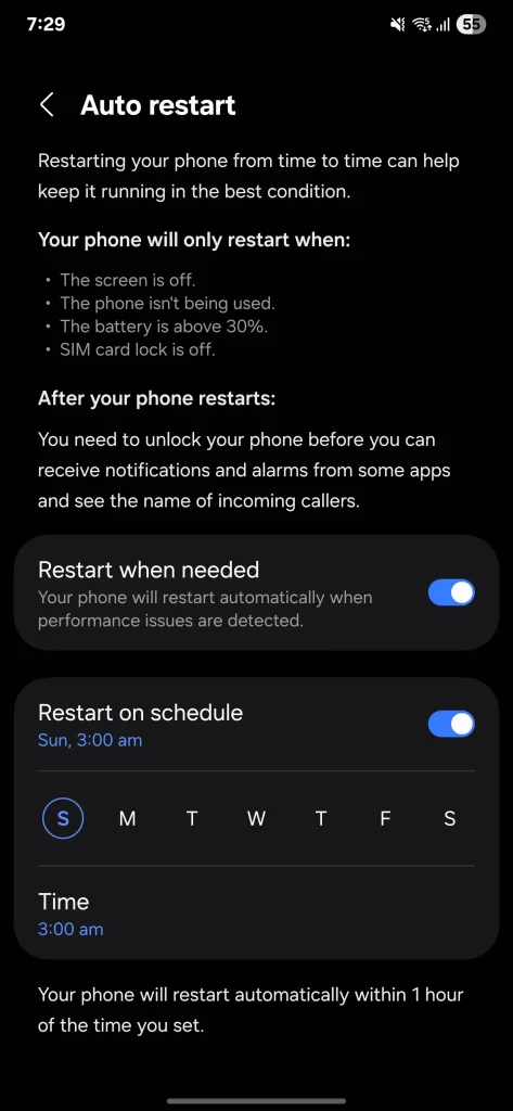 شخصيًا، قمت بضبط هاتفي لإعادة التشغيل في الساعة 3 صباحًا من يوم الأحد. بهذه الطريقة، تتم إعادة تشغيل الهاتف أثناء نومي، مما يجعله يبدو جديدًا وجاهزًا للاستخدام عندما أستيقظ.