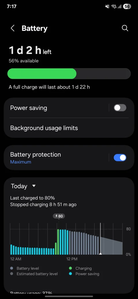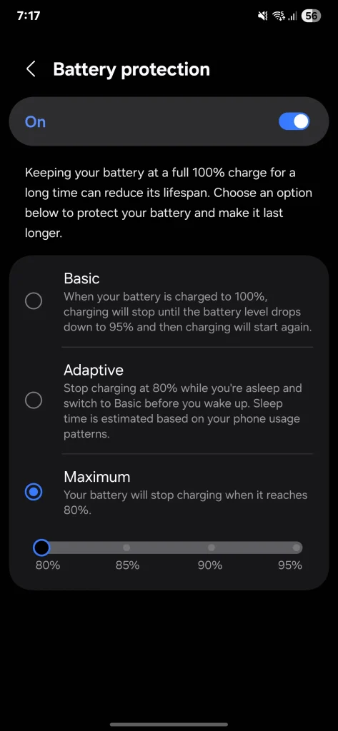 أثناء وجودك بالفعل في قائمة Battery (البطارية)، ابحث عن Battery protection (حماية البطارية). في One UI 7، ستجد خيارات مثل Basic (أساسي) أو Adaptive (تكيفي) أو Maximum (أقصى). يعمل خيار Adaptive (تكيفي) على إيقاف الشحن مؤقتًا عند 80٪ طوال الليل ويكمله قبل الاستيقاظ، بينما يتيح لك خيار Maximum (أقصى) تحديد نسبة مئوية لإيقاف الشحن عندها. كلاهما يساعد في الحفاظ على صحة البطارية على المدى الطويل دون الحاجة إلى القيام بأي شيء خاص. تذكر أن تفعيل خاصية حماية البطارية يساهم في إطالة عمر البطارية.