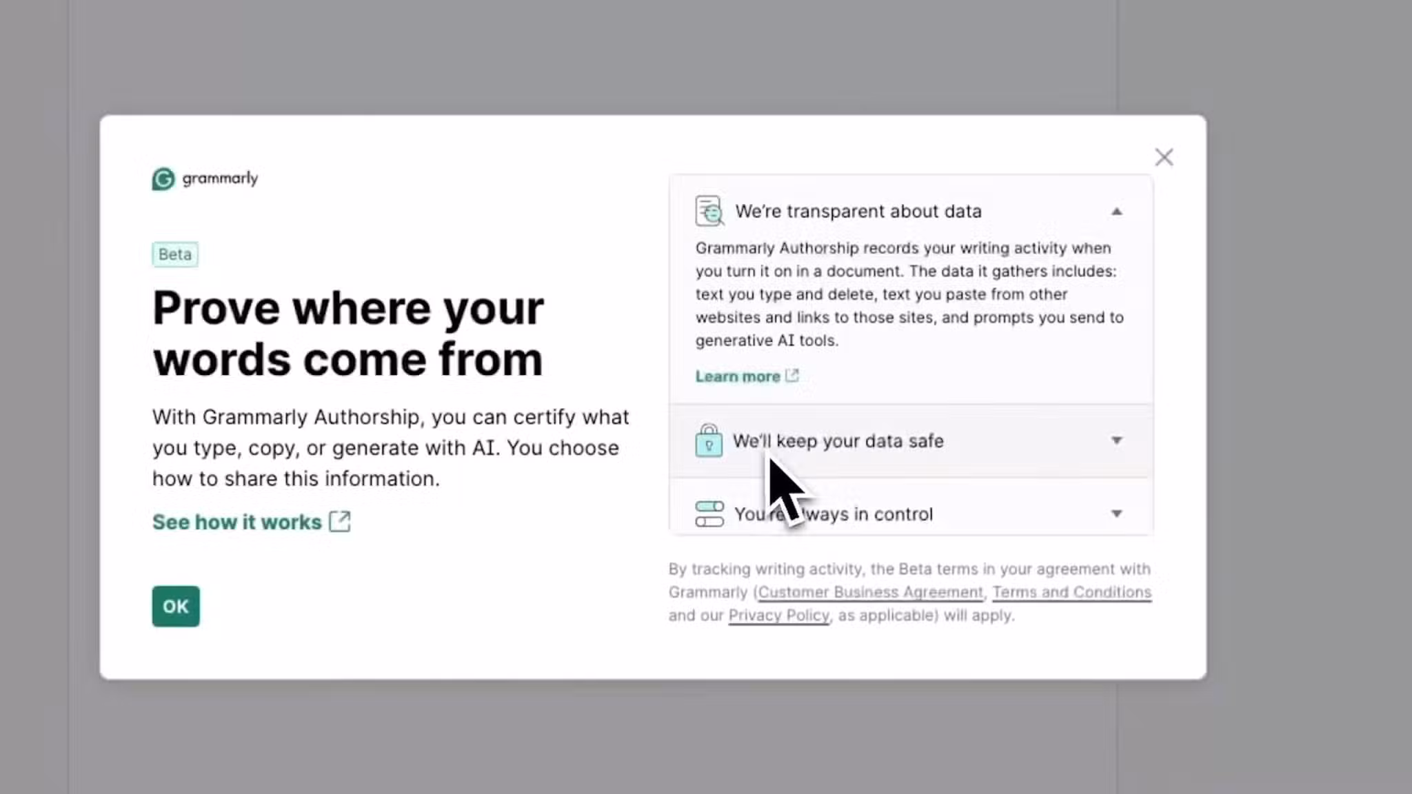 يمكنه التمييز بين الأجزاء التي تم كتابتها في المستند وتلك التي تم نسخها ولصقها من مصدر قائم على الويب أو مصدر آخر غير معروف. يمكنه أيضًا تحديد ما إذا كان جزء من النص قد تمت إعادة صياغته باستخدام إمكانات الذكاء الاصطناعي التوليدي في Grammarly. سيساعد هذا التتبع في إثبات أنك (أو شخصًا ما) على الأقل قمت بكتابة الورقة التي تقدمها إلى أستاذك.