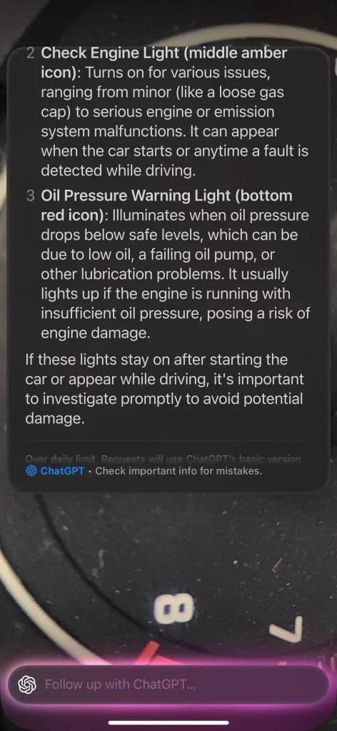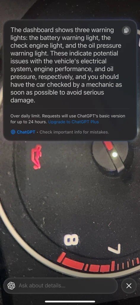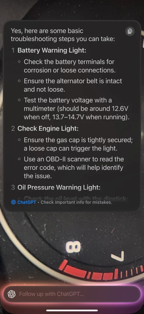 تشمل السيناريوهات الأخرى التي يمكن أن يكون فيها هذا مفيدًا تحديد الأخطاء وإصلاحها (مثل الشاشة الزرقاء للموت) على جهاز الكمبيوتر الخاص بك، والتعرف على الأضواء الموجودة على لوحة القيادة في سيارتك، أو تحديد الغرض من زر على جهاز أو مركبة. هذه الميزة تعزز بشكل كبير قدرة المستخدم على الصيانة الذاتية وفهم الأعطال الشائعة.