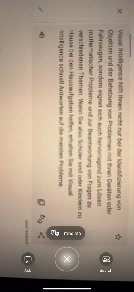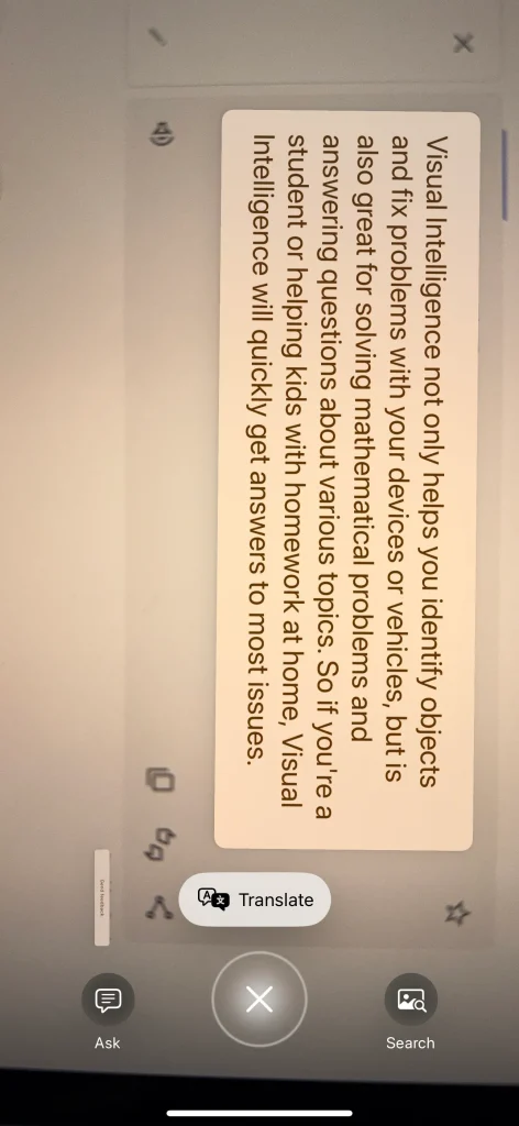 في الأوقات التي تصادف فيها نصًا ولكن لا يمكنك قراءته، ربما لأنك في مركبة متحركة أو ليس لديك الوقت، يمكنك أن تطلب من Visual Intelligence قراءته بصوت عالٍ لك. هذه الميزة مفيدة بشكل خاص في حالات إمكانية الوصول أو عند الحاجة إلى “الاستماع” إلى المعلومات أثناء التنقل.