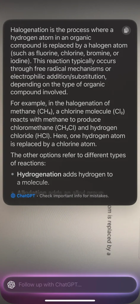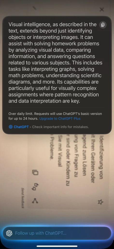 تقوم Visual Intelligence بعمل جيد في تحديد نوع الاستجابة التي يتطلبها السؤال والإجابة عليه وفقًا لذلك. على سبيل المثال، إذا كانت معادلة رياضية، فستقوم Visual Intelligence بتقسيم الحل إلى خطوات مع شرح. وفي الوقت نفسه، إذا كان سؤالًا متعدد الاختيارات، فستعطيك ببساطة الإجابة الصحيحة من بين جميع الخيارات، على الرغم من أنه يمكنك أن تطلب منها شرح إجابتها بالتفصيل كسؤال متابعة. هذه القدرة على تقديم إجابات مفصلة وشروحات تجعلها أداة تعليمية قيمة للغاية.
