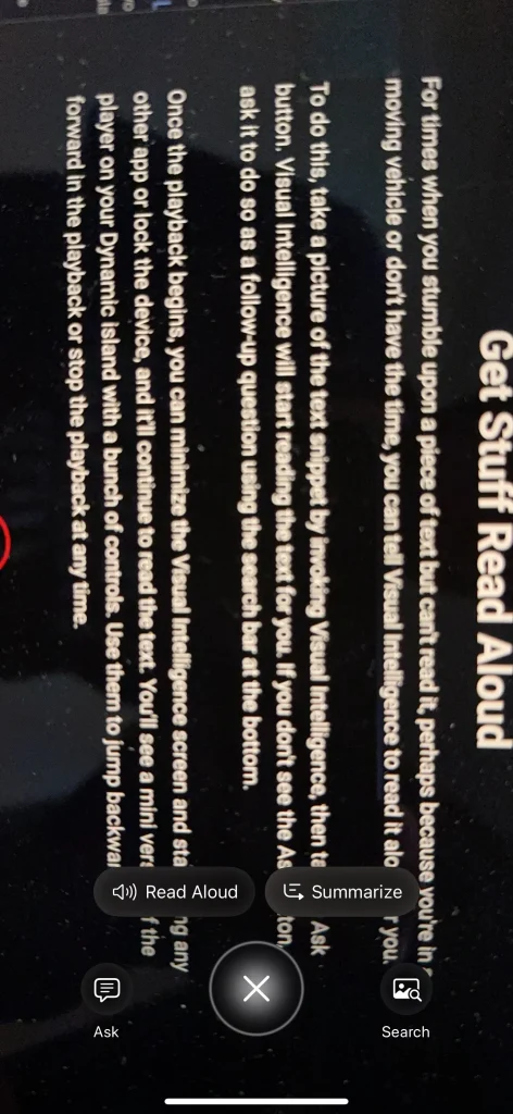 للقيام بذلك، التقط صورة لمقتطف النص عن طريق استدعاء Visual Intelligence، ثم انقر على زر “Ask” أو “اسأل”. سيبدأ Visual Intelligence بقراءة النص لك. إذا كنت لا ترى الزر، فاطلب منه القيام بذلك كسؤال متابعة باستخدام شريط البحث في الأسفل. هذه الطريقة فعالة لتحويل النصوص المطبوعة إلى محتوى مسموع بسرعة وسهولة.