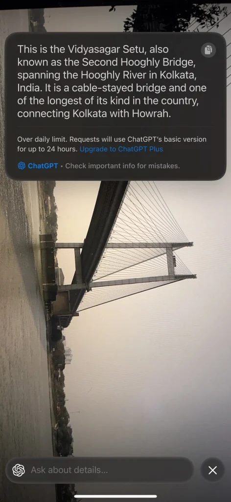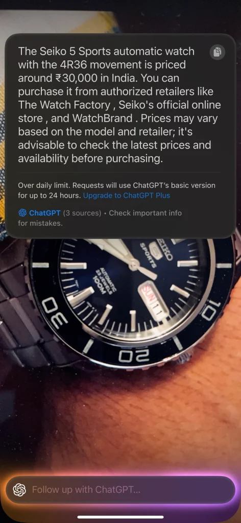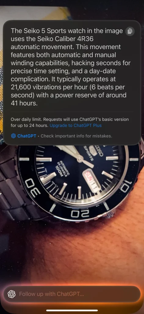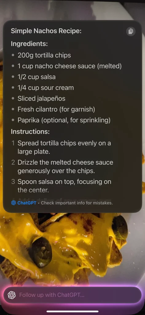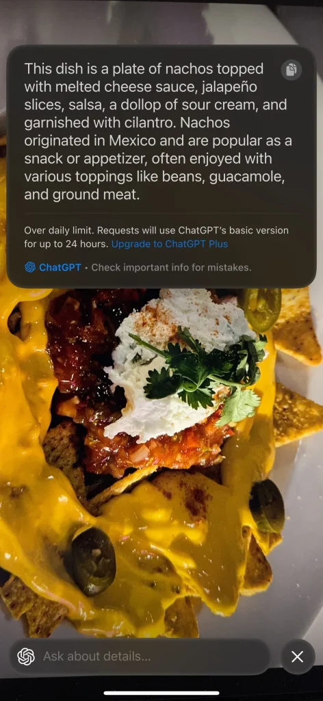 لتحديد السعرات الحرارية في طبق ما، قم بتشغيل الذكاء المرئي – عبر زر الإجراء أو مركز التحكم – والتقط صورة للطبق. اضغط على اسأل (Ask)، وسيقوم الذكاء المرئي بالاستعلام من ChatGPT لإرجاع اسم الطبق وعدد السعرات الحرارية التقريبي. يمكنك بعد ذلك المتابعة وطرح المزيد من الأسئلة أو ربما طلب وصفة الطبق.