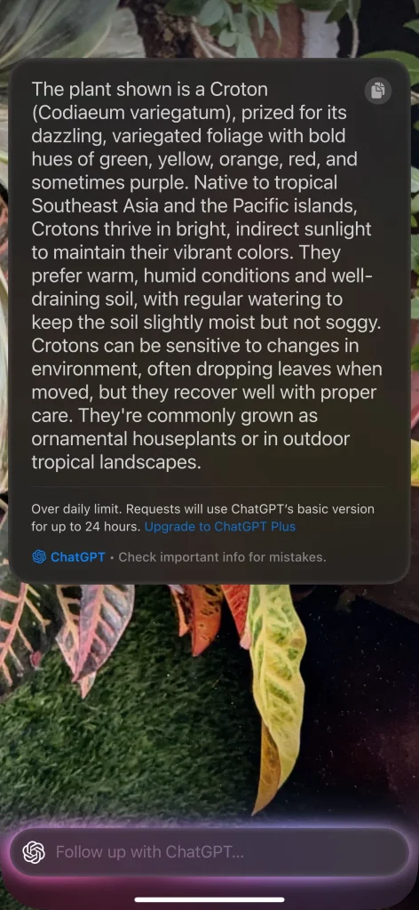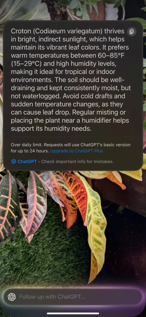 يمكن للذكاء المرئي التعرف على النباتات والحيوانات بفعالية عبر مختلف الأنواع، على الرغم من أنه قد يواجه بعض الصعوبات في تحديد السلالات المختلطة من الحيوانات. بمجرد التعرف على النوع، يمكنك طرح المزيد من الاستفسارات حول النبات أو الحيوان. على سبيل المثال، إذا كان نباتًا، يمكنك سؤال الذكاء المرئي عن اسمه المحلي، أو البيئة المثالية لنموه الأمثل، أو بعض الحقائق الشيقة عنه. هذه القدرة تجعل الذكاء المرئي أداة قوية للتعلم والاستكشاف في مجالات علم النبات وعلم الحيوان.