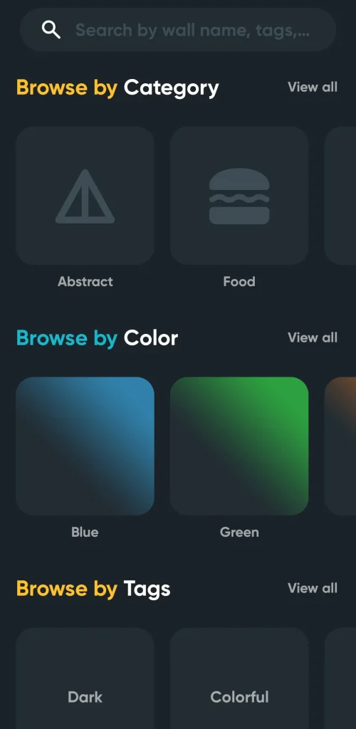 يمكنك تصفح الخلفيات حسب الفئات الأنيقة مثل “مجردة” (Abstract)، و”طعام” (Food)، و”بسيط” (Minimal)، و”ثقافة البوب” (Pop Culture)، أو التعمق أكثر باستخدام العلامات مثل “داكن” (Dark)، و”ملون” (Colorful)، و”سماء” (Sky)، و”كواكب” (Planets). يتوفر أيضاً خيار البحث إذا كنت تبحث عن أسماء خلفيات معينة أو تصميمات مستوحاة من شخصيات معينة. *ملاحظة: استخدام العلامات يساعد في تسريع عملية البحث عن الخلفيات المطلوبة.*