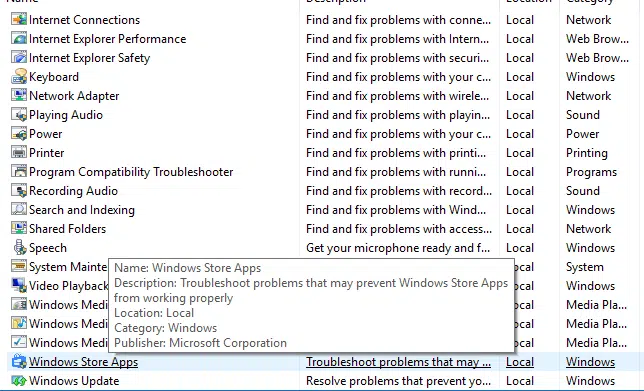 كل ما عليك هو الوصول إلي ادوات الاصلاح والصيانة المدمجه مع نظام ويندوز وذلك عبر الانتقال إلي لوحة التحكم Control Panel ثم بعد ذلك تنتقل إلي Troubleshooting وهنا ستقوم بالضغط علي خيار View all المتواجد في الجهة اليسري علي الشاشة او نافذة Troubleshooting وبعدها سيتم عرض جميع ادوات الصيانة امامك ومن ضمنها اداة Windows Store Apps التي يُمكنها مساعدتك في حل مشاكل التطبيقات والمتجر في الويندوز.