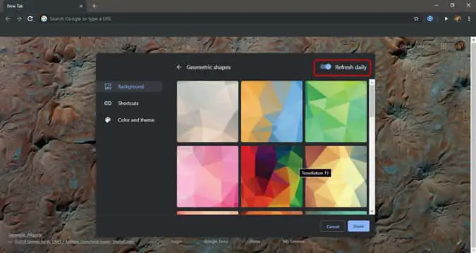 علاوة على ذلك ، تحصل أيضًا على ميزة مكافئة لـ Bing Daily والتي لا يزال ليس لها اسم. لذلك ، سوف نسميها فقط Daily Update حسب اسم التبديل. سيؤدي هذا ببساطة إلى إعداد خلفية جديدة في علامة تبويب جديدة كل يوم. بالإضافة إلى ذلك ، يمكنك أيضًا تعديل شاشتك الرئيسية باستخدام اختصارات مواقع الويب المخصصة أو تلك التي تم ملؤها مسبقًا استنادًا إلى سجل التصفح.