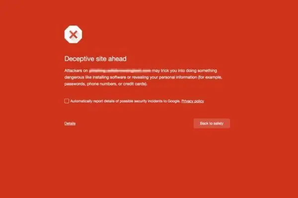 و فور ولوج المستخدم إلى مثل هذه المواقع ستظهر رسالة على الشاشة تخبره بأن الموقع الذي يود الولوج إليه من المواقع الخادعة و بالتالي يحجب من طرف المتصفح.