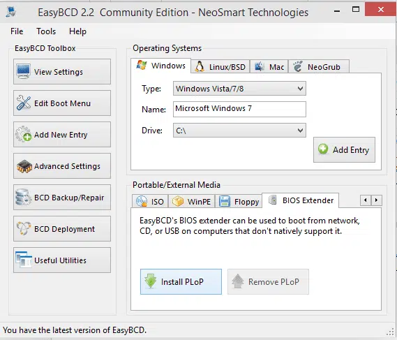 كل ما عليك هو تحميل وتثبيت وتشغيل البرنامج ثم تقوم بالضغط علي Add New Entry ثم ستجد خيار Portable/External Media واسفله هناك خيار للـ BIOS Extender فتقوم بالضغط علي Install PLoP تماماً كما بالصورة بالاعلي.