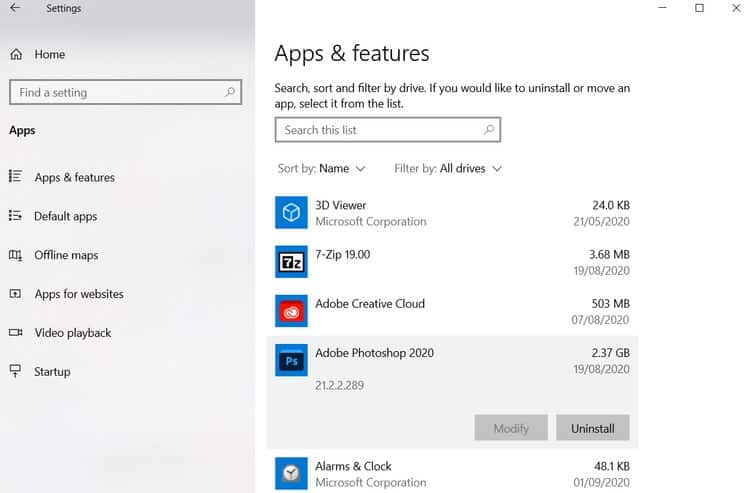 لرؤية جميع التطبيقات الموجودة على جهاز الكمبيوتر الخاص بك ، انتقل إلى قائمة ابدأ -> الإعدادات -> التطبيقات -> التطبيقات والميزات. قم بالتمرير لأسفل القائمة وانقر فوق إلغاء التثبيت على أي شيء لا تحتاجه.
