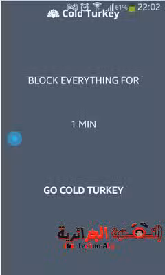 التطبيق يدعى “Cold Turkey” و هو مجاني و متوفر بمتجر جوجل بلاي و سيمكنك من الإبتعاد عن هاتفك لمدة تتراوح ما بين دقيقة و 60 دقيقة، حيث و بعد تفعيل المدة المحددة ستجد نفسك غير قادر على الولوج لأي تطبيق بهاتفك 😀