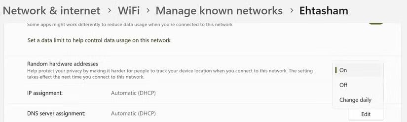 لتمكين عناوين الأجهزة العشوائية لشبكة مُعينة، انتقل إلى إدارة الشبكات المعروفة، وحدد الشبكة المطلوبة، واضبط خيار عنوان الأجهزة العشوائي على تمكين.