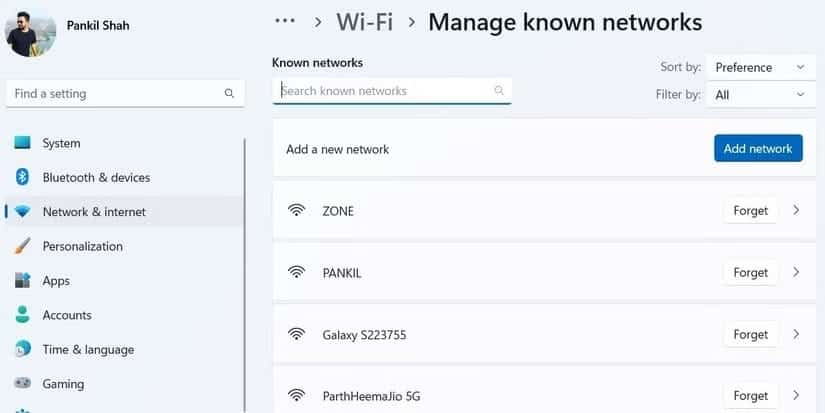 لنسيان شبكة Wi-Fi محفوظة، افتح الإعدادات -> الشبكة والإنترنت -> Wi-Fi -> إدارة الشبكات المعروفة. حدد الشبكة التي تُريد إزالتها وانقر فوق نسيان.