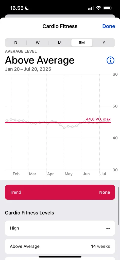 بمجرد أن تقوم ساعة Apple Watch الخاصة بك بقياس الحد الأقصى لاستهلاك الأكسجين (VO2 max) لديك (يمكنك الاطلاع عليه في تطبيق Health > Heart > Cardio Fitness)، يمكنك الحصول على الكثير من البيانات المفيدة، مثل تحديد ما إذا كانت مستويات لياقتك القلبية الوعائية أعلى من المتوسط. بناءً على هذه البيانات، يمكنك تحديد ما إذا كنت بحاجة إلى تغيير روتين التمرين الأسبوعي الخاص بك. على سبيل المثال، لم أكن راضيًا عن الحد الأقصى لاستهلاك الأكسجين (VO2 max) الخاص بي، لذلك قررت دمج الجري لمسافات طويلة في برنامجي التدريبي.