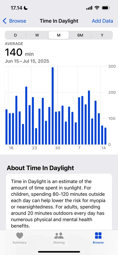 هذه الميزة مُفعّلة افتراضيًا، وأعتقد أنها دقيقة إلى حد كبير بناءً على تجربتي الشخصية. يمكنك تتبعها من خلال الانتقال إلى تصفح > الصحة النفسية في تطبيق Health. هذه الميزة تستخدم بيانات من Apple Watch لتحديد الوقت الذي تقضيه في الخارج، مع الأخذ في الاعتبار مستويات الإضاءة المحيطة.