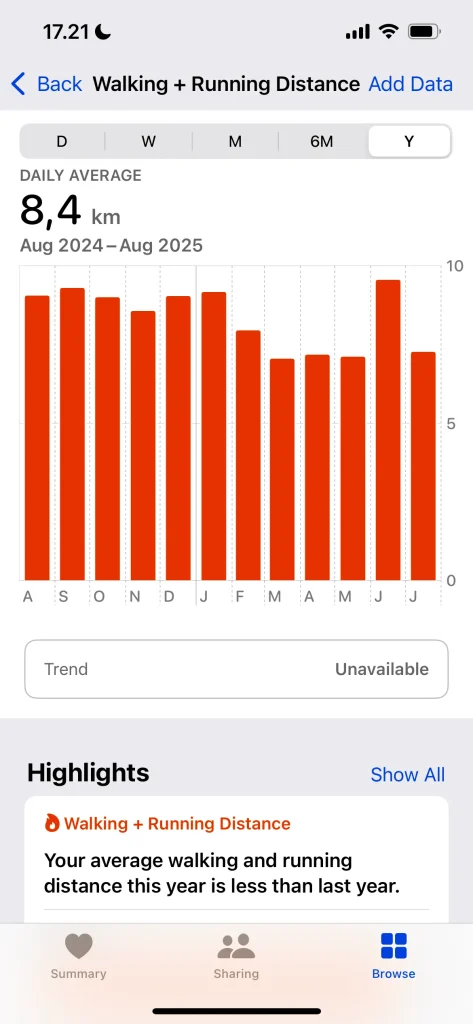 تعتبر ميزة “مسافة المشي والجري” (Walking + Running Distance)، الموجودة في تطبيق “صحتي” (Health) ضمن تصفح > النشاط (Browse > Activity)، طريقة سهلة لمعرفة إجمالي المسافة التي قطعتها يوميًا. كقاعدة عامة، يبدو أن المشي أو الجري لمسافة 8-10 كيلومترات (5-6 أميال) يوميًا مناسب لي، ولكنني أود تجربة زيادة ذلك إلى 15 كيلومترًا (9 أميال) في المستقبل.