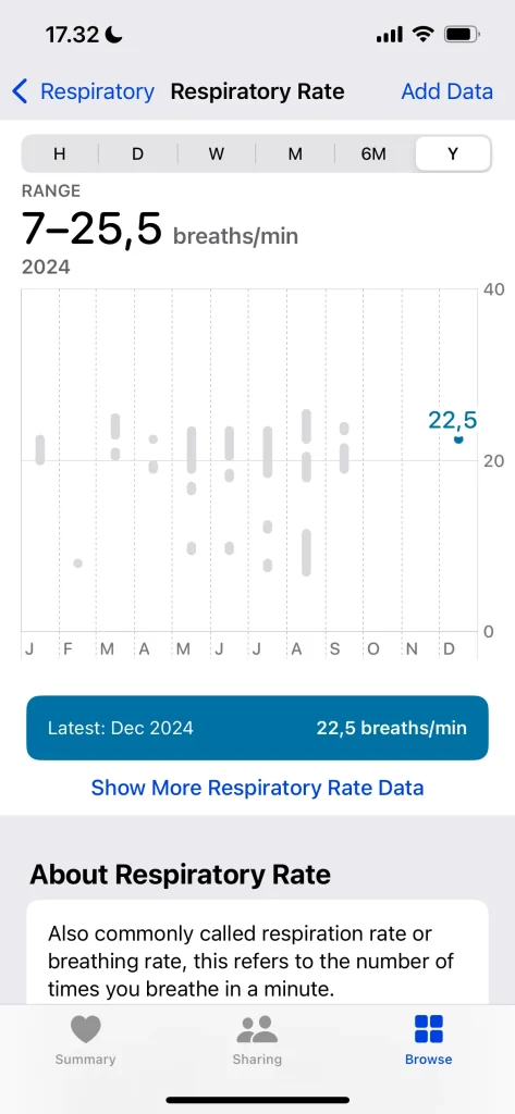 بالإضافة إلى تتبع الحد الأقصى لاستهلاك الأكسجين (VO2 max)، يمكنك أيضًا عرض متوسط معدل تنفسك باستخدام Apple Watch. يوضح لك هذا عدد الأنفاس التي تأخذها في الدقيقة، وهو أمر مفيد بشكل خاص عند فحص معدل تنفسك أثناء الراحة. يعتبر أقل موثوقية بعض الشيء أثناء التمرين، حيث ستحتاج بشكل طبيعي إلى التنفس أكثر.
