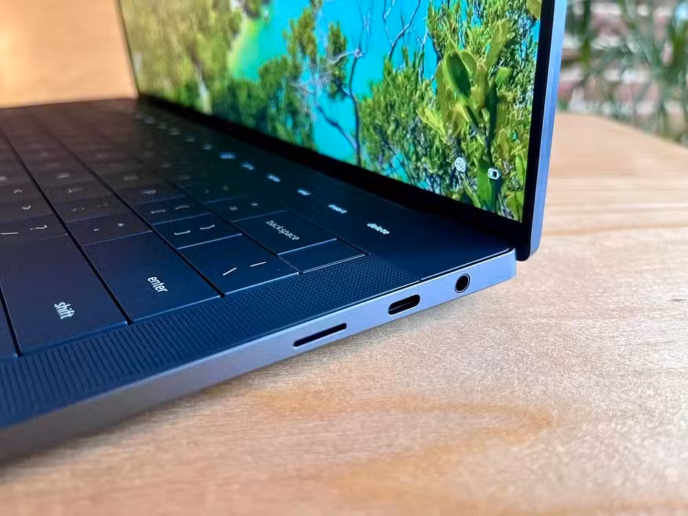 ستحصل على خمسة منافذ. أحدها مقبس سماعة رأس، والآخر قارئ بطاقة microSD. الأخير جيد لتوسيع مساحة التخزين المتاحة على جهازك حيث تجلس البطاقة بشكل مسطح تقريبًا على جانب الكمبيوتر المحمول. ومع ذلك، فإنَّ هذا أمر مؤسف للمُصورين ومصوري الفيديو الذين يعملون ببطاقات SD كاملة الحجم ويأملون في إدخالها بسرعة في الكمبيوتر المحمول.