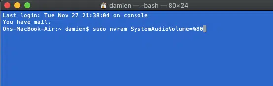 للرجوع إلى الإعداد الافتراضي ، أي لتمكين رنين بدء التشغيل ، أدخل هذا الأمر المُبدل في Terminal: