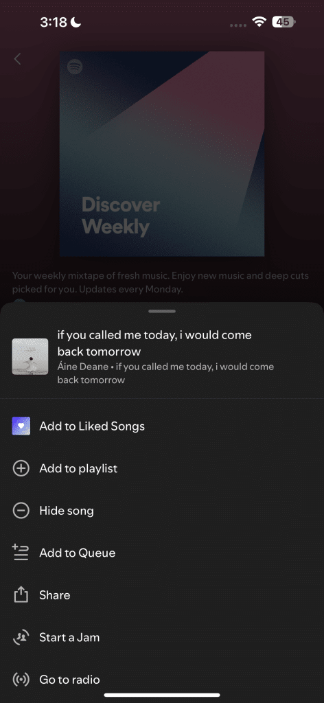 إذا لم تكن راضيًا عن قائمة “اكتشافات الأسبوع” الخاصة بك، فتفاعل معها لتوجيه خوارزمية Spotify ونظام التوصيات. يمكنك تخطي أغنية أو النقر على النقاط الثلاث الأفقية بجوارها، ثم تحديد “إخفاء الأغنية” من القائمة.