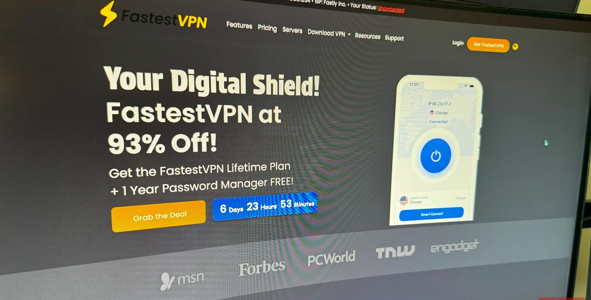 كمثال حديث، بحثت عن شبكات VPN “مدى الحياة” ووجدت واحدة تسمى FastestVPN، والتي لم أسمع بها من قبل. العلامة الحمراء الفورية هي العد التنازلي الوهمي على الصفحة الرئيسية لأحدث “صفقة” لها: “عرض حصري للعام الجديد” (في شهر مايو، عندما زرت الموقع). فحصت شروط الخدمة ولم يكن هناك ذكر لخطة “مدى الحياة”، لذلك لا يوجد ضمان للمدة التي ستستمر فيها هذه الخطة.