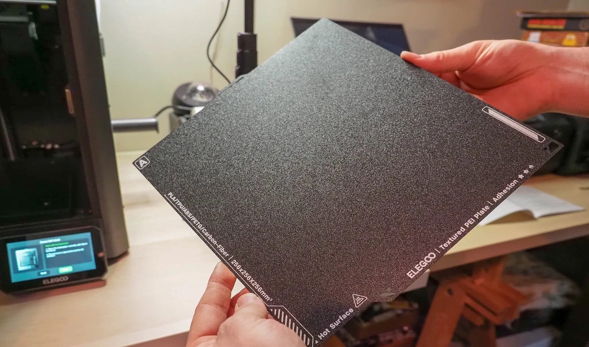 بالإضافة إلى ذلك، توفر Elegoo صفيحة PEI محكمة مزدوجة الجوانب مع جانب مخصص خصيصًا لالتصاق PLA. إذا انتهيت من الطباعة أثناء غيابك، فإن خيار إعادة تسخين منصة الطباعة يسهل إزالة المطبوعات، خاصةً عند السحب من جانب PLA ذي الالتصاق الأقصى. بالنسبة لأي أجزاء صغيرة متبقية، يمكن أن يساعد الكاشط المرفق في المهمة، سواء كان ذلك في معالجة قواعد الدعم الرقيقة المتبقية أو بقايا الحواف. استخدام صفيحة PEI يقلل من الحاجة إلى المواد اللاصقة الإضافية ويسهل عملية إزالة المطبوعات.