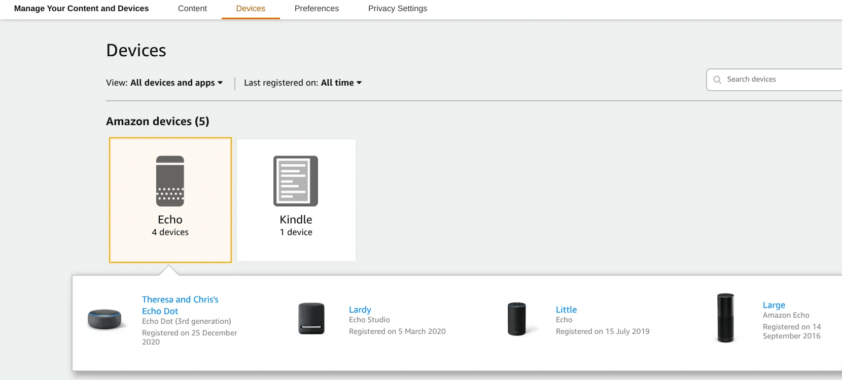 لإلغاء تسجيل أجهزة Alexa الخاصة بك على موقع الويب، انقر فوق الحساب والقوائم > إدارة المحتوى والأجهزة. انقر فوق الأجهزة، ويجب أن ترى قائمة بأجهزة Amazon المسجلة. حدد أحد الأجهزة، وستفتح لك خيارات متنوعة. يجب أن ترى خيار إلغاء التسجيل للجهاز، لذا انقر فوقه وتابع بمجرد قراءة تحذير Amazon. تذكر أن إلغاء التسجيل سيؤدي إلى إزالة الجهاز من حسابك وسيمنعه من الوصول إلى خدمات Amazon.