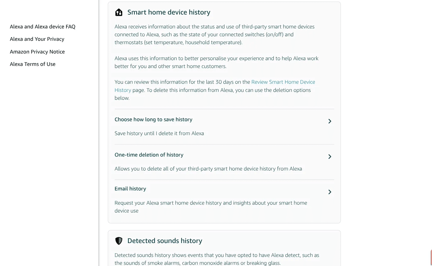 لحذف سجل أجهزة المنزل الذكي على الموقع الإلكتروني، انتقل إلى صفحة خصوصية Alexa وانقر على مراجعة سجل أجهزة المنزل الذكي > إدارة سجل أجهزة المنزل الذكي الخاص بي. كما هو الحال في التطبيق، يمكنك تحديد حذف السجل لمرة واحدة لمسح كل شيء.