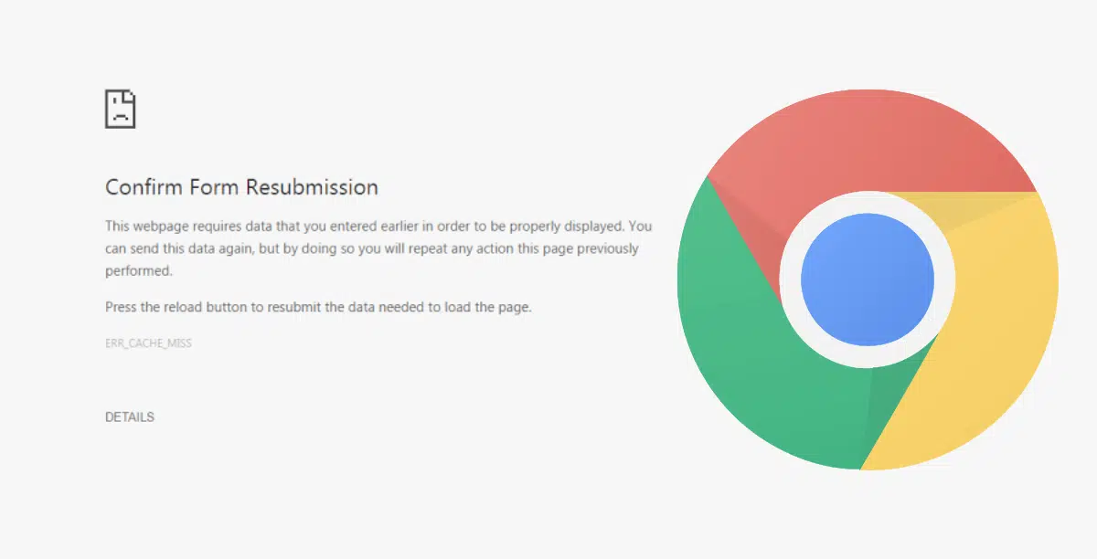 يظهر على الفور على الشاشة مع الرسالة: “تأكيد إعادة إرسال النموذج” ورسالة خطأ فرعية: ERR_CACHE_MISS.
