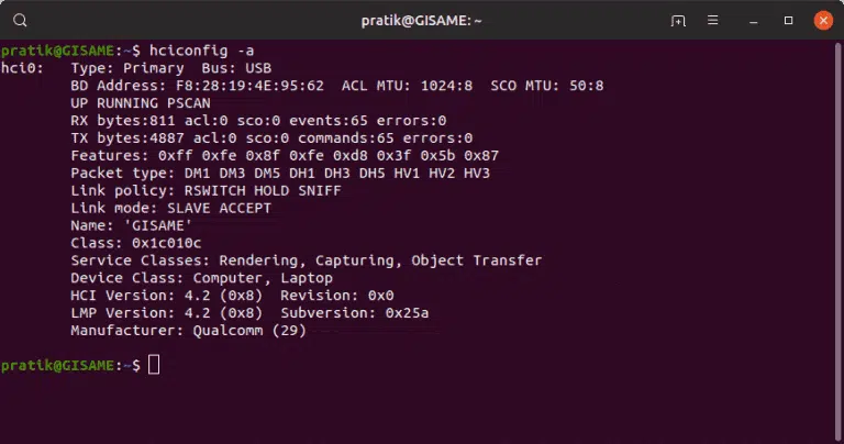 أنا استخدام جهاز الكمبيوتر المحمول Acer E5-575G مع Ubuntu 19.04 الذي يحمل الاسم الرمزي Disco Dingo. وحدة Bluetooth التي قمت بتثبيتها من شركة Microsoft. بادئ ذي بدء ، نحن بحاجة إلى التحقق مما إذا كان Ubuntu يمكنه التعرف على وحدة Bluetooth. لذلك ، قم بتشغيل Bluetooth وتشغيل الأمر التالي. يجب أن تحصل على إخراج مماثل لقطة الشاشة أدناه.