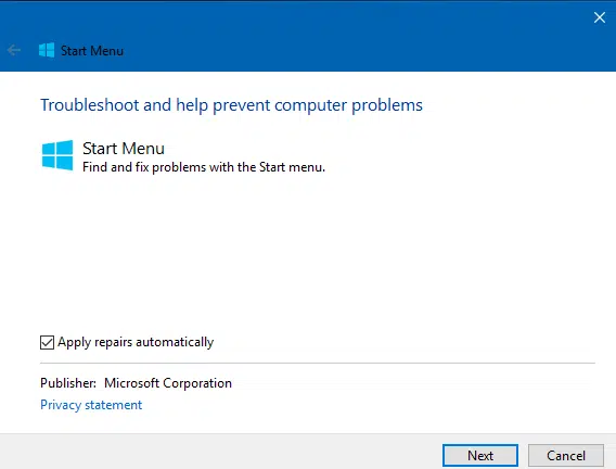 اداة Fix Start Menu هي اداة مصممة من قبل شركة مايكروسوفت لإصلاح العديد من المشاكل المتعلقة بقائمة إبدأ حيث يمكنها حل مشكلة قائمة إبدأ لا تعمل او التطبيقات لا يتم تثبيتها بشكل صحيح او التطبيقات لا يتم تشغيلها عن طريق البلاطات المثبته علي القائمة..وغيرها الكثير، كما انها لا تحتاج تثبيت، فبمجرد أن تقوم بتحميل ملف الاداة كل ما عليك هو النقر مرتين عليه لبدأ تشغيله ومن ثم تضغط علي زر Advanced تضع علامة ✅ امام خيار الاصلاح التلقائي لأي مشاكل يكتشفها. وبعدها تضغط علي زر Next بالاسفل لتبدأ عملية الفحص والاصلاح وعليك بعد الانتهاء من ذلك بأن تقوم بعمل إعادة تشغيل للحاسوب وتقوم بتجربة فتح قائمة إبدأ مرة آخري.