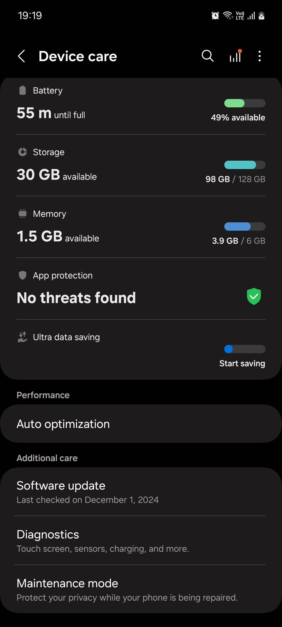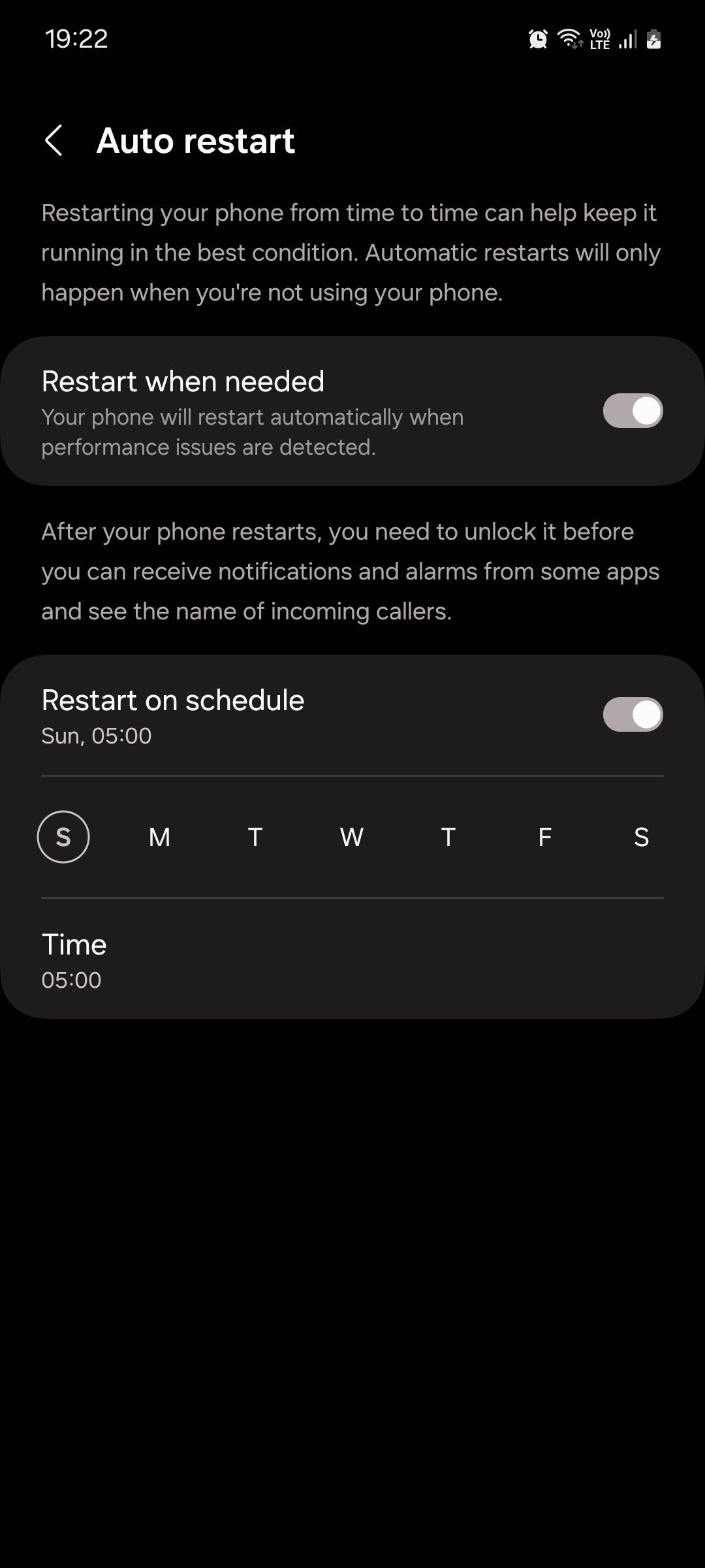 أوصي بوضع تذكير أسبوعي لإعادة تشغيل هاتفك. على أجهزة Samsung، يمكنك أتمتة هذه العملية بالذهاب إلى الإعدادات -> العناية بالجهاز -> التحسين التلقائي -> إعادة التشغيل التلقائي.