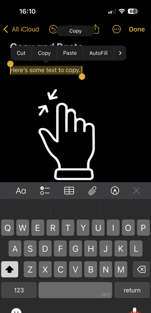 بدلاً من ذلك، قم بالقرص بثلاثة أصابع (بنفس الطريقة التي تقوم بها بتكبير الصورة بإصبعين) لنسخ النص المحدد حاليًا. للقص بدلاً من ذلك (إزالة النص من مكانه الحالي)، قم بإجراء إيماءة القرص بثلاثة أصابع هذه مرتين.
