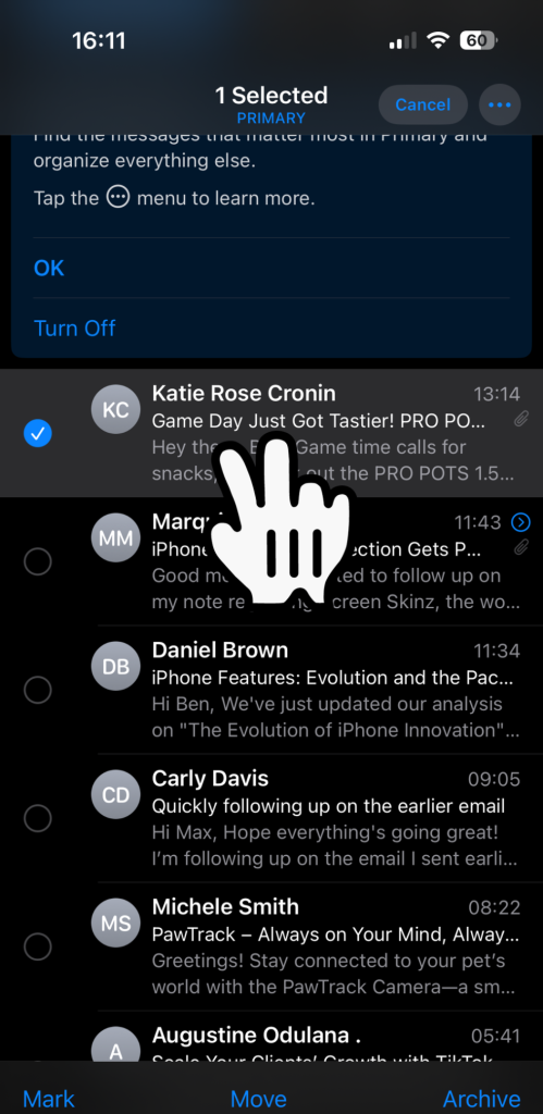 على سبيل المثال، في تطبيق Mail، استخدم إصبعين للضغط على أول رسالة بريد إلكتروني، ثم اسحب لأسفل على الفور. بمجرد القيام بذلك، سترى دوائر تحديد تظهر على الجانب الأيسر. استمر في تحريك أصابعك لأسفل فوق العناصر التالية لتحديدها بسرعة.