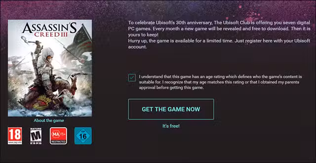 في البداية الالعاب التي قدمتها الشركة احتفالاً بعامها الـ 30 هي جزء Sands of Time من لعبة Prince of Persia وايضاً لعبة Tom Clancy’s Splinter Cell ولعبة Rayman Origins وكذلك The Crew وجزء Blood Dragon من لعبة Far Cry 3 المميزة، وكما أشرت لكم تم إطلاق كل لعبة علي مدار 6 أشهر في عام 2016 وكان للمُستخدم حق الحصول عليها مجاناً من هذا الرابط [30years.ubi.com] ولعبة Assassin’s Creed 3 تعد آخر هذه الالعاب التي يُمكنك الحصول عليها علي مدار ايام الشهر الجاري (ديسمبر) وحتي يوم 7 من يناير 2017.