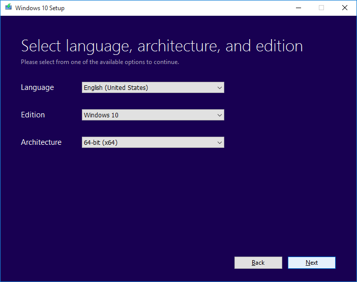 رابعا: الاداة سوف تسالك اي لغة تريد و اي اصدار و اي نسخة تريد ، الاجابات ستكون : اللغة تقوم باختيار لغة النظام ، الاصدار ستقوم باختيار الاصدار الذي تريد عمل ملف ISO له و النسخة ستقوم باختيار نوع النسخة التي تريده القيام بها 32بت او 64 بت.