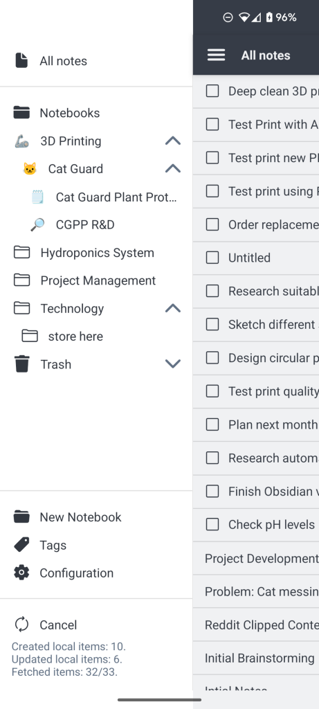 بعد إعداد هيكل مشروعي بالكامل وقائمة المهام، أمسك هاتفي وأضغط على مزامنة في تطبيق Joplin. كل ما أنشأته يظهر على جهازي المحمول في ثوانٍ معدودة. هيكل الدفاتر المتداخلة، وكل ملاحظاتي بتنسيقها سليمًا، وقوائم المهام الخاصة بي متاحة على الفور. يمكنني متابعة البحث، أو تحديد العناصر المكتملة، أو إضافة أفكار جديدة أينما كنت.
