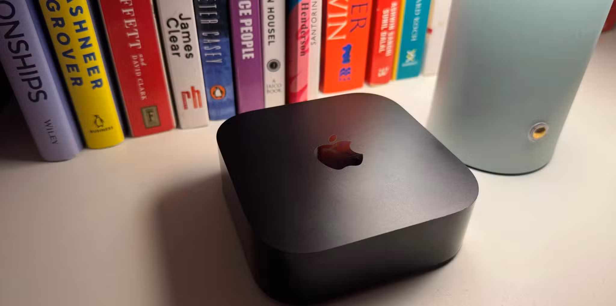 جهاز Apple TV مع بعض الكتب في الخلفية