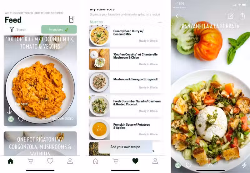 في الصفحة الرئيسية ، قم بالتمرير خلال الوصفات الموسمية مثل حساء البيض أو العدس والبطاطا الحلوة. تُسلط الصور المشرقة والملونة الضوء على مُكوِّنات كل وصفة ، ويُمكنك بسهولة تنسيق المُكوِّنات التي تنال إعجابك باستخدام زر “المفضلة”.