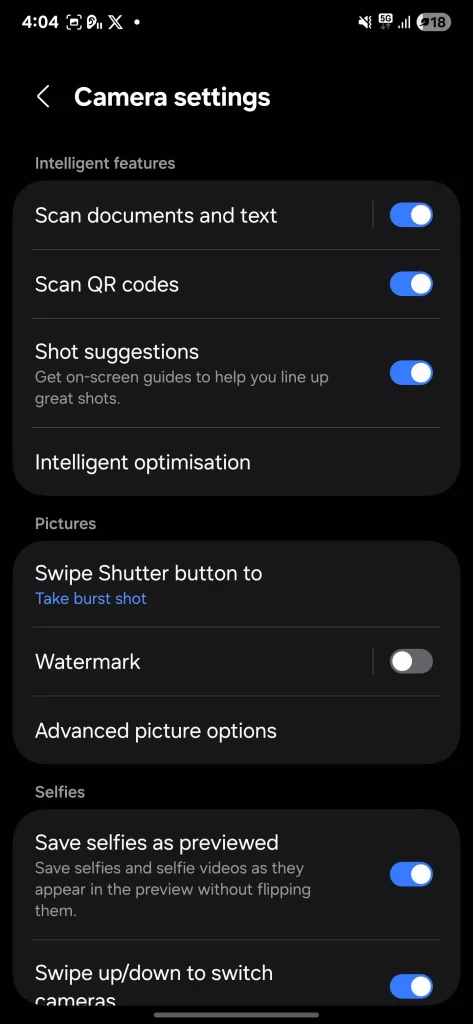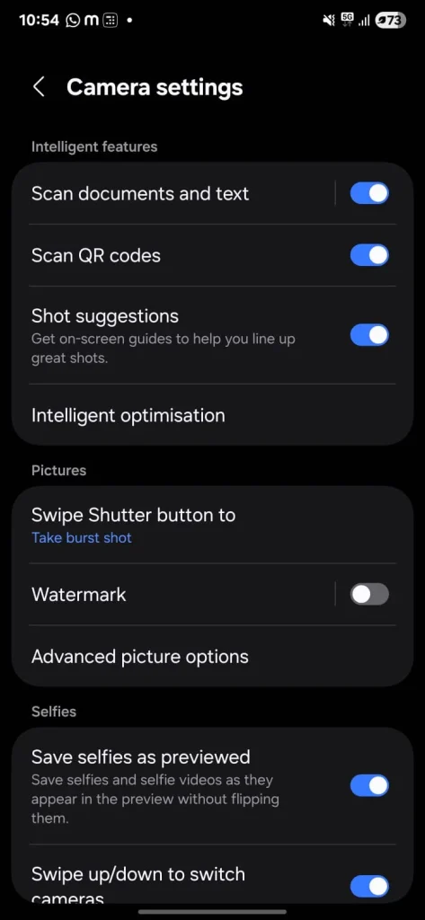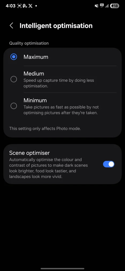 لاستخدام مُحسِّن المشهد (Scene Optimizer)، افتح تطبيق الكاميرا وانقر على أيقونة الإعدادات. في قائمة الإعدادات، انقر فوق Intelligent optimisation، ثم قم بتبديل Scene optimiser إلى وضع التشغيل.