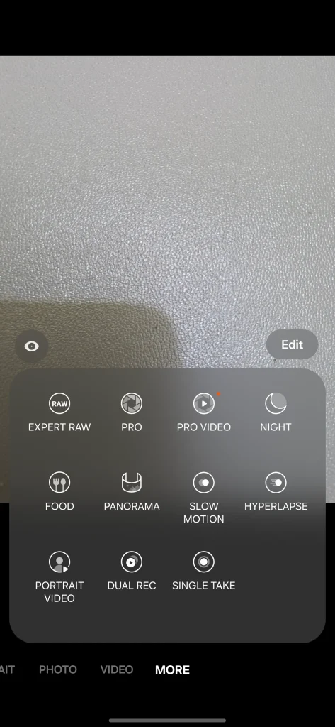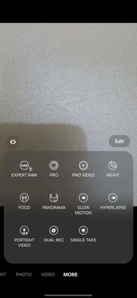 لبدء استخدام الوضع الاحترافي PRO Mode، افتح تطبيق الكاميرا واضغط على زر المزيد في الجزء السفلي الأيمن. ثم، ما عليك سوى تحديد PRO للانتقال إلى الوضع الاحترافي. من هنا، يمكنك ضبط إعدادات مثل ISO وسرعة الغالق وتوازن اللون الأبيض وتعويض التعريض.