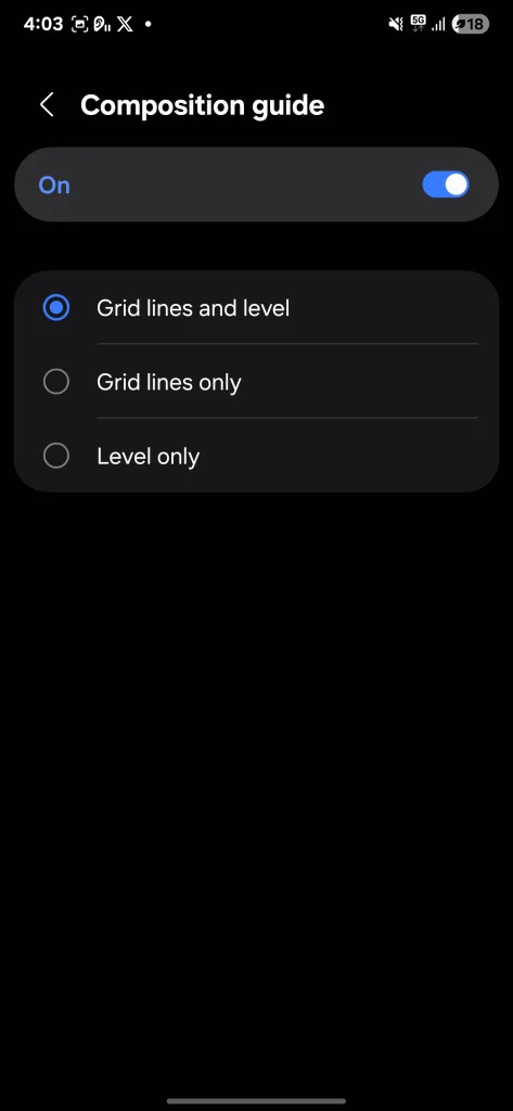 أثناء توجيه الكاميرا، يظهر هدف صغير على الشاشة، يرشدك لإمالة الكاميرا أو تعديل الزاوية، بحيث تبدو صورتك أكثر توازنًا واحترافية وجاذبية بصرية. يتحرك الهدف أثناء تغيير موضع الكاميرا، وعندما تصطف كل العناصر بشكل صحيح، يتحول إلى اللون الأصفر لتأكيد أنك وجدت التكوين المثالي. هذه الميزة تعتمد على خوارزميات متقدمة لتحليل المشهد.